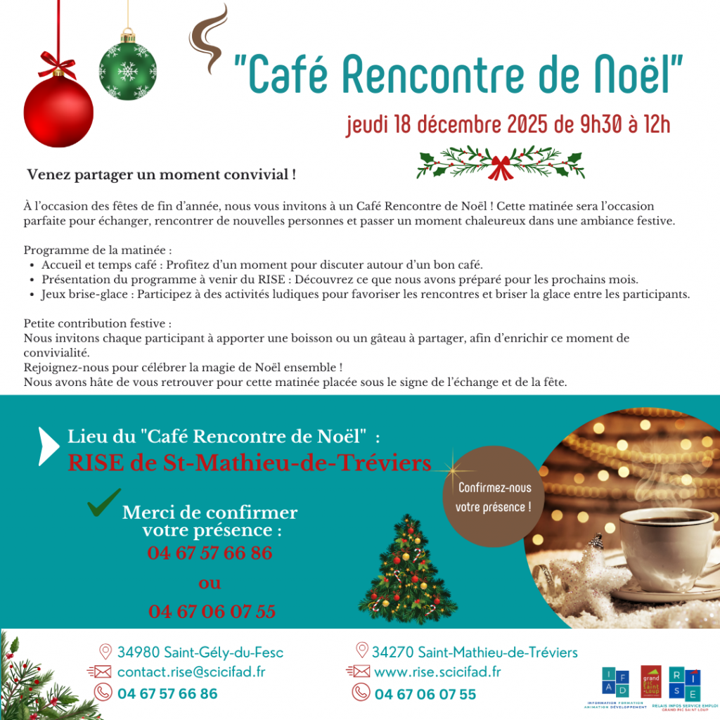 À l’occasion des fêtes de fin d’année, nous vous invitons à un Café Rencontre de Noël ! Cette matinée sera l’occasion parfaite pour échanger, rencontrer de nouvelles personnes et passer un moment chaleureux dans une ambiance festive.